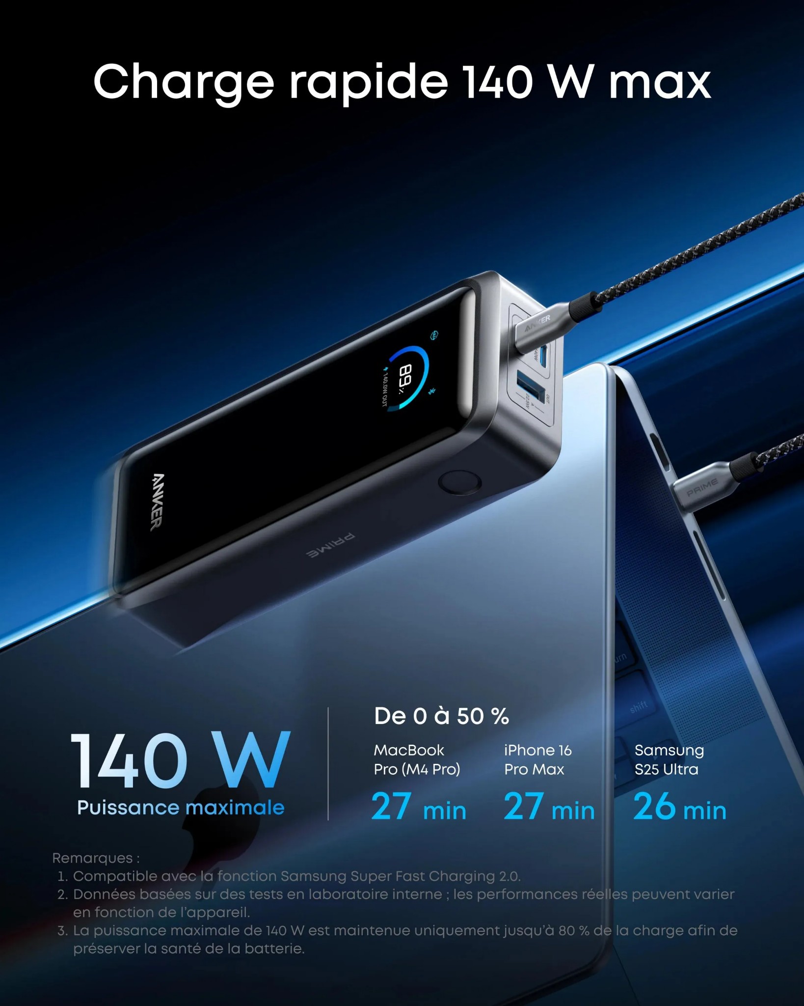 Traitez votre batterie externe comme tout autre appareil à batterie au lithium. Essayez de ne pas la laisser descendre à 0 % ni de la maintenir constamment à 100 %. Rechargez-la plutôt lorsqu’elle atteint 20–30 % et débranchez-la une fois qu’elle est pleine. Gardez le boîtier et les ports propres en essuyant délicatement la poussière et la saleté, et évitez de laisser tomber ou d’écraser l’appareil. Utilisez des câbles fiables qui s’adaptent bien, car des câbles lâches ou effilochés peuvent provoquer des arcs électriques et un excès de chaleur. Ne couvrez pas la batterie externe pendant son utilisation, surtout lors de la charge rapide, afin que la chaleur puisse s’échapper.