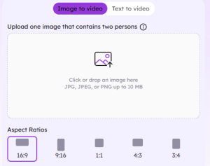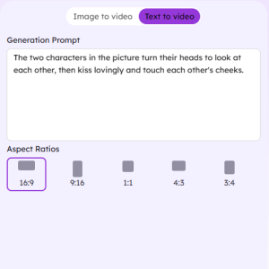 • Personnaliser :Ajustez les paramètres tels que le rapport hauteur/largeur (16:9, 9:16, 1:1, etc.), la qualité vidéo (720p) et la durée (5 secondes).